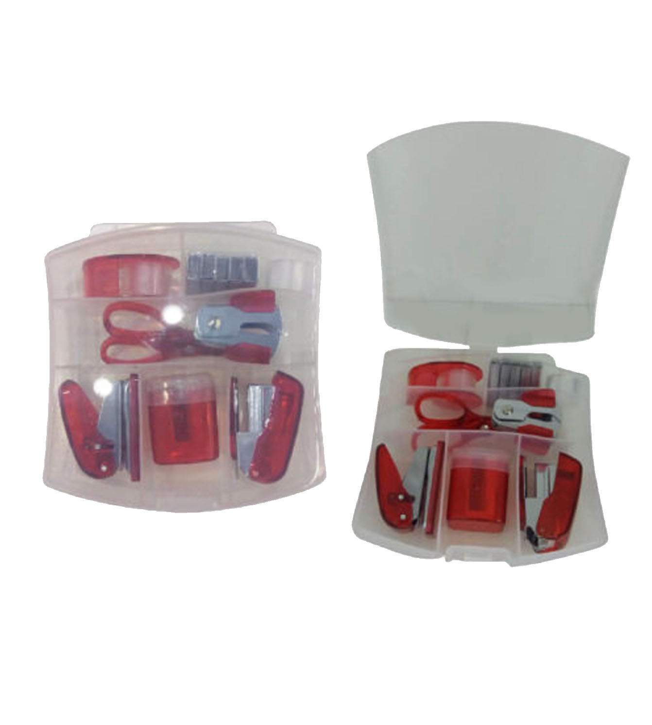 Estuche de plástico blanco traslúcido, contiene: 1 engrapadora, 1 tajador, 1 perforadora de 1 hueco, 1 saca grapas, 1 tijera, 1 dispensador con cinta adhesiva, 1 cinta adhesiva de repuesto y grapas.